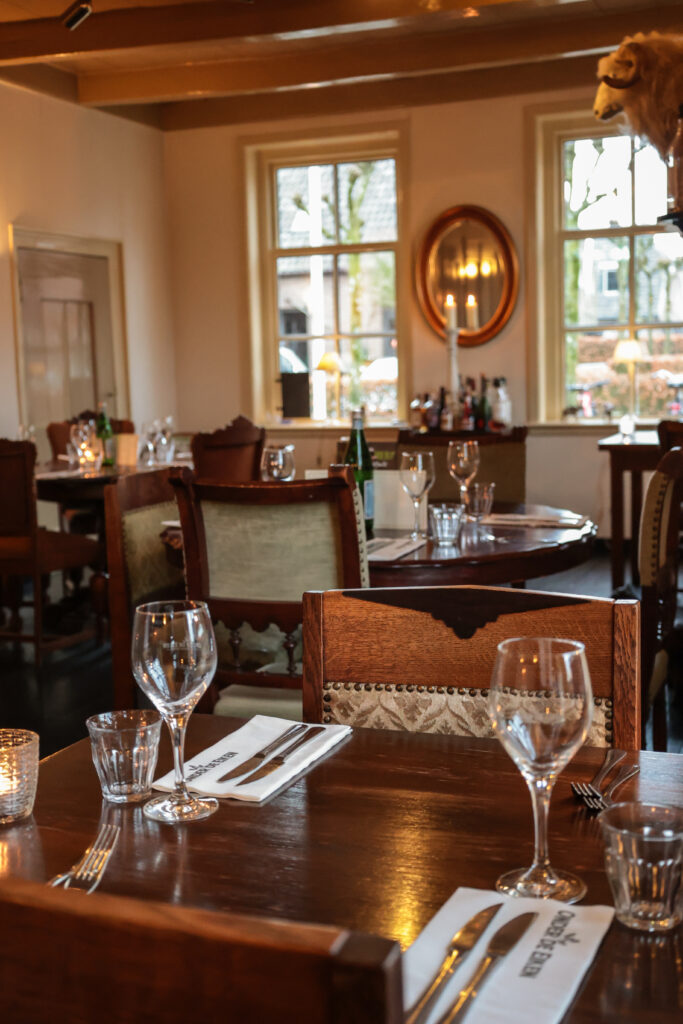 Het rustige, met heggen omsloten, terras vindt u in de tuin achter de boerderij. Hier zit u in de zomer romantisch onder de “oude” appelboom of tegen de warme boerderijmuur. Staande kijken over de heggen in de tijdloze kruidentuin, over de oude es naar de bosrand of boerderijen in de verte. Zakt de temperatuur of slaat het weer om dan blijft de ambiance op peil in de oude boerderij. In de winter, achter het waolend glas, genieten van onze wildgerechten mijmeren naar het voorjaar.